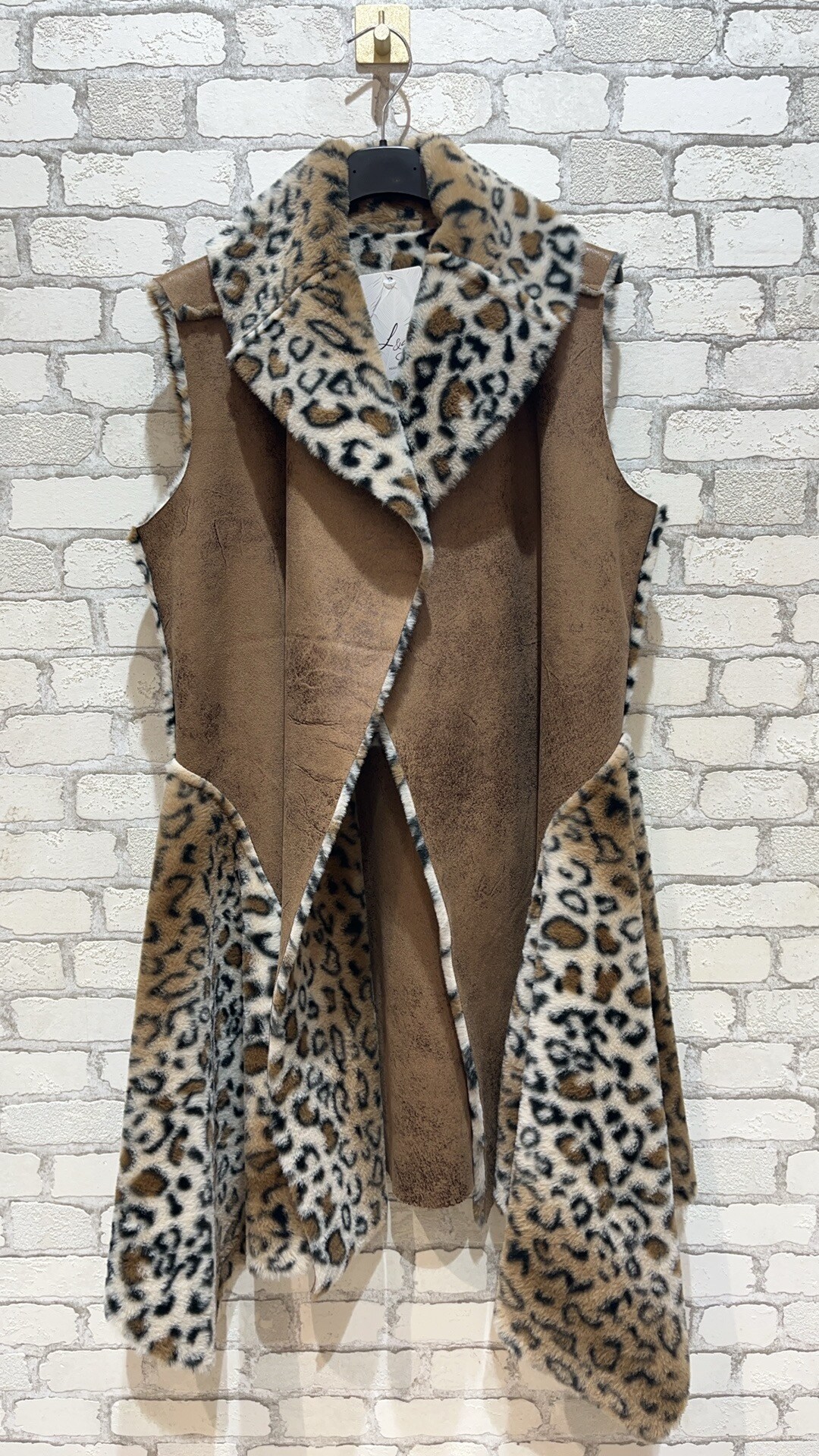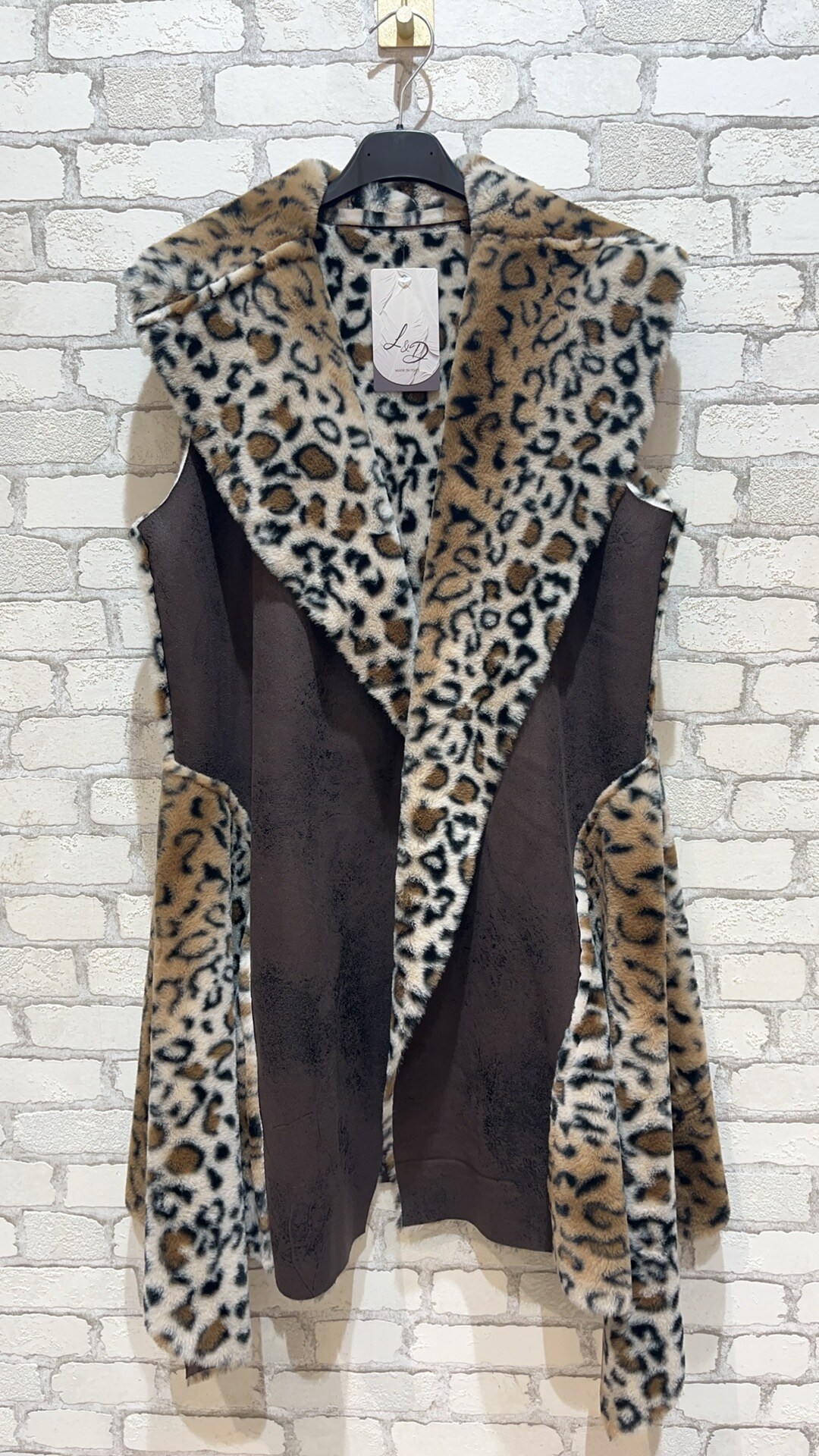 Turn heads while staying snug in this statement faux-fur gilet. Featuring a bold leopard print trim paired with a rich chocolate brown suede-look body, this piece is the perfect mix of glam and everyday wearability. The padded (polyester) design adds extra warmth without the bulk, while the soft faux-fur lining and oversized collar bring all the cosy vibes.