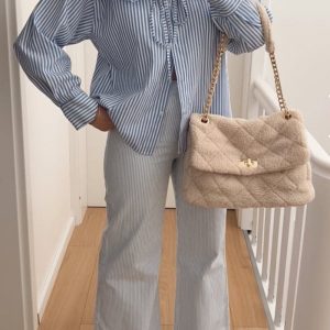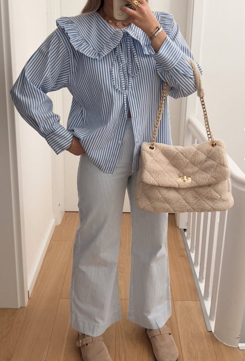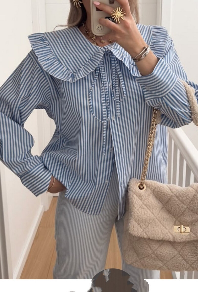 Step into timeless elegance with our Pin-Striped Claudine Collar Shirt – a standout piece for your Spring/Summer 2025 wardrobe. Made from 100% breathable cotton, this long-sleeved buttoned shirt combines comfort and style in the most effortless way. Designed with an oversized cut for a relaxed silhouette, it features a delicate Claudine collar trimmed with soft ruffles for that extra touch of charm. The subtle pinstripe pattern adds a fresh, feminine vibe, making this shirt a versatile staple for any occasion.