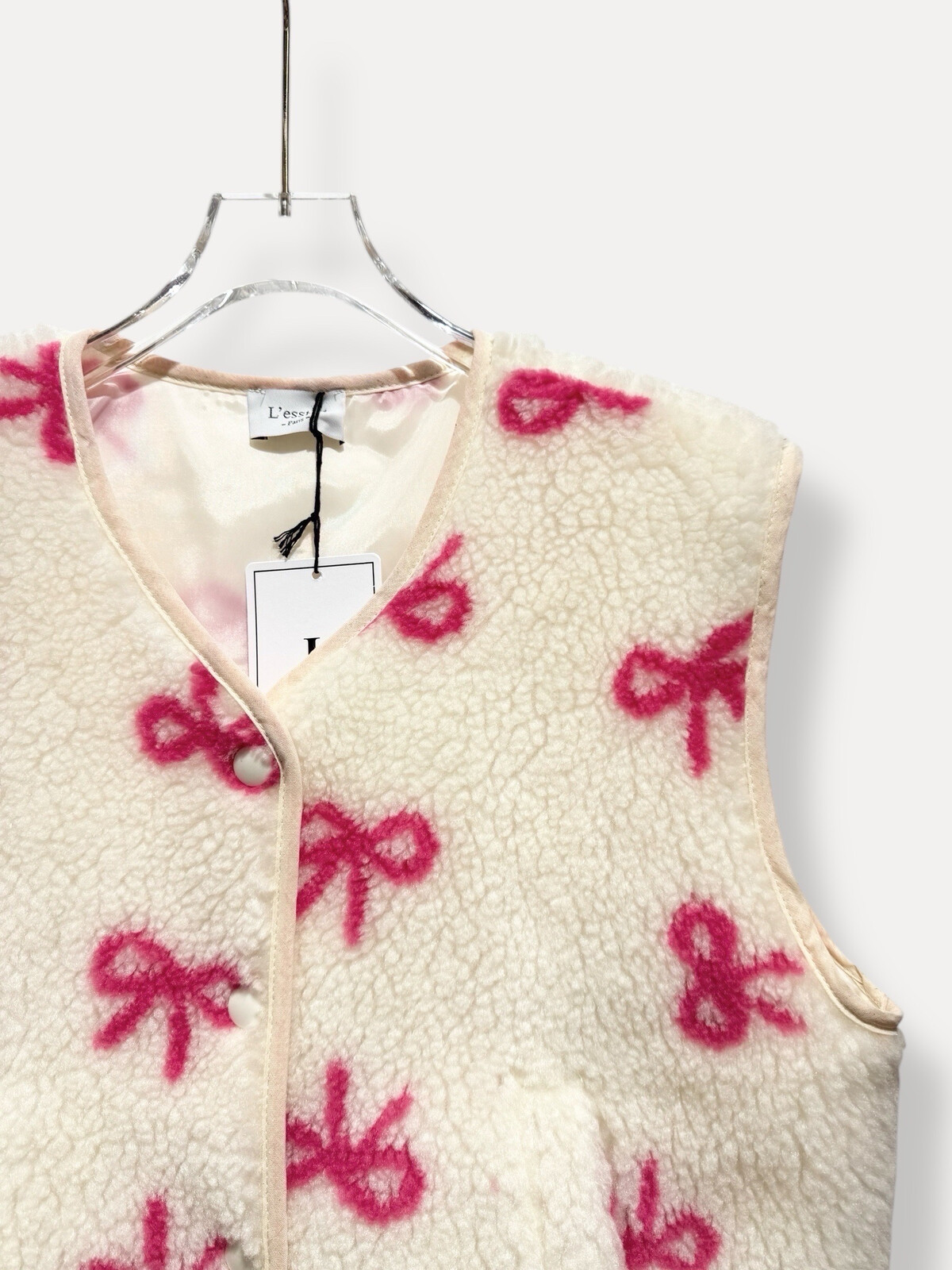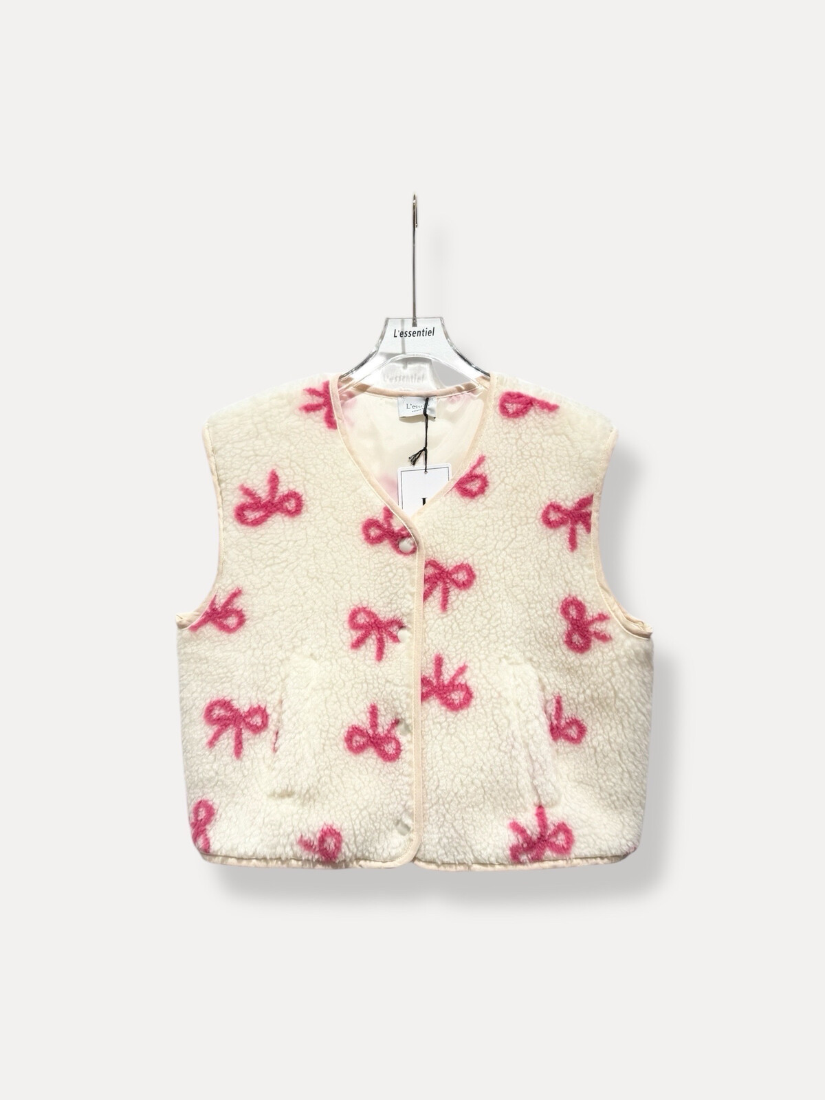 Add a touch of charm to your wardrobe with our Small Teddy Vest, designed for a soft and stylish look. Featuring delicate ribbon bows, a buttoned front, and two side pockets, this vest is both practical and adorable. Made from 100% plush polyester, it’s perfect for layering while keeping you comfy and on-trend.